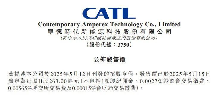 宁德时代公告称,公司于5月12日刊发招股章程,发售价于5月15日确定为每股H股263港元(不包括1%经纪佣金、0.0027%证监会交易征费、0.00565%联交所交易费及0.00015%会财局交易征费)。